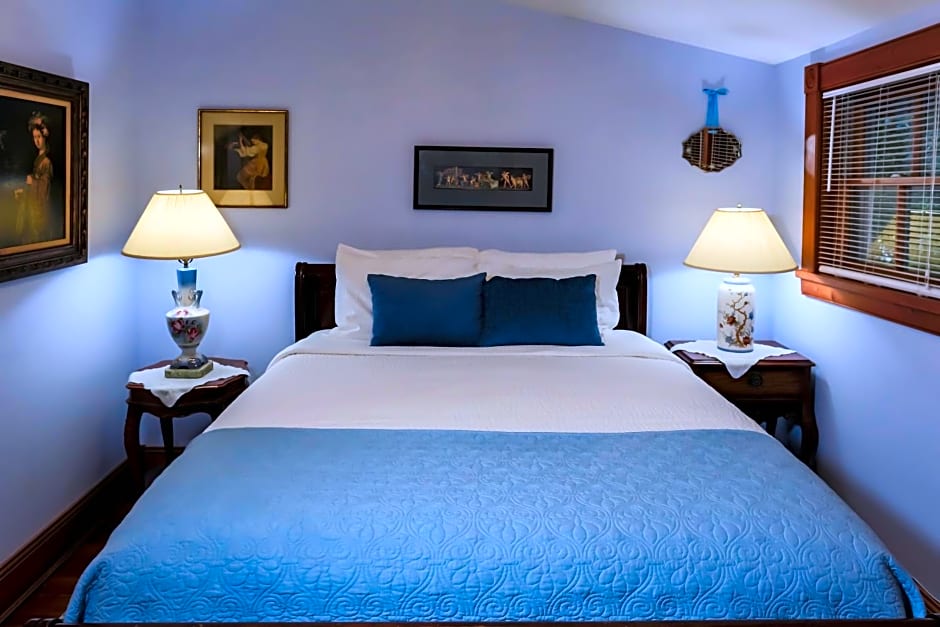 Located on level 3, this queen room features a custom stained glass window. The private bathroom is outside of the room and features a 6-foot spa bath and shower.