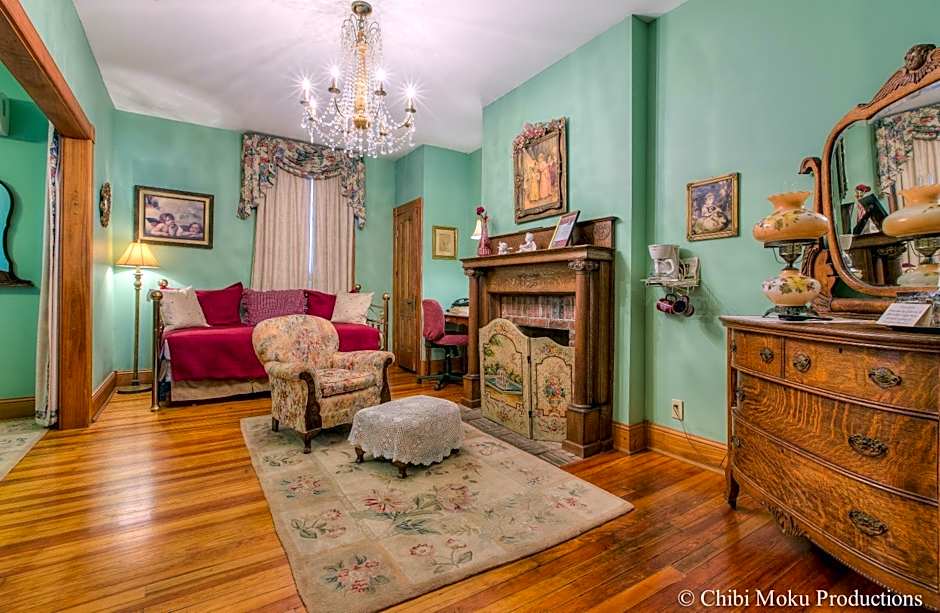 Featuring a mural of a wisteria tree, this queen room is located on level 2 and includes a fireplace and private bathroom with walk-in shower.